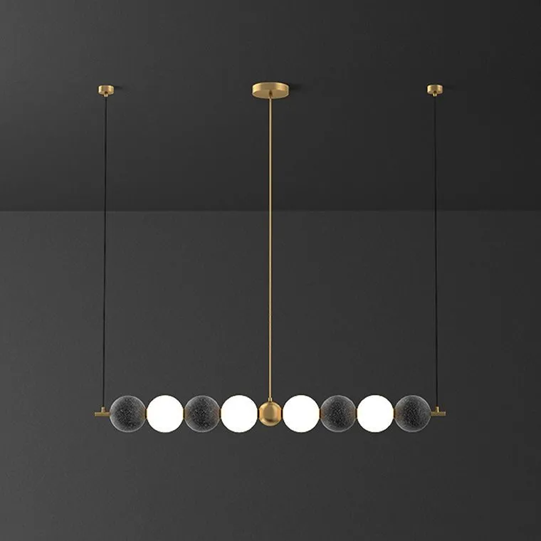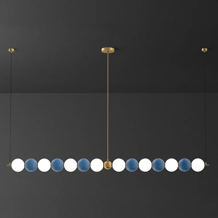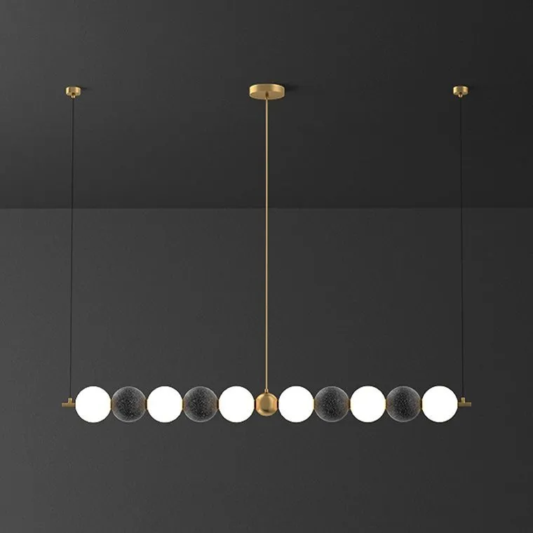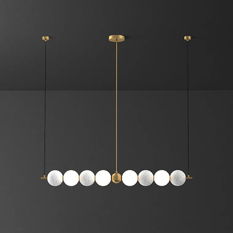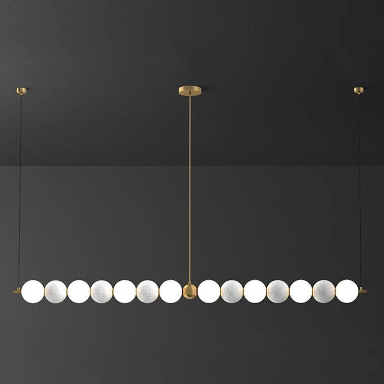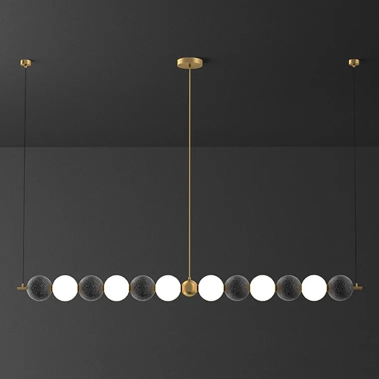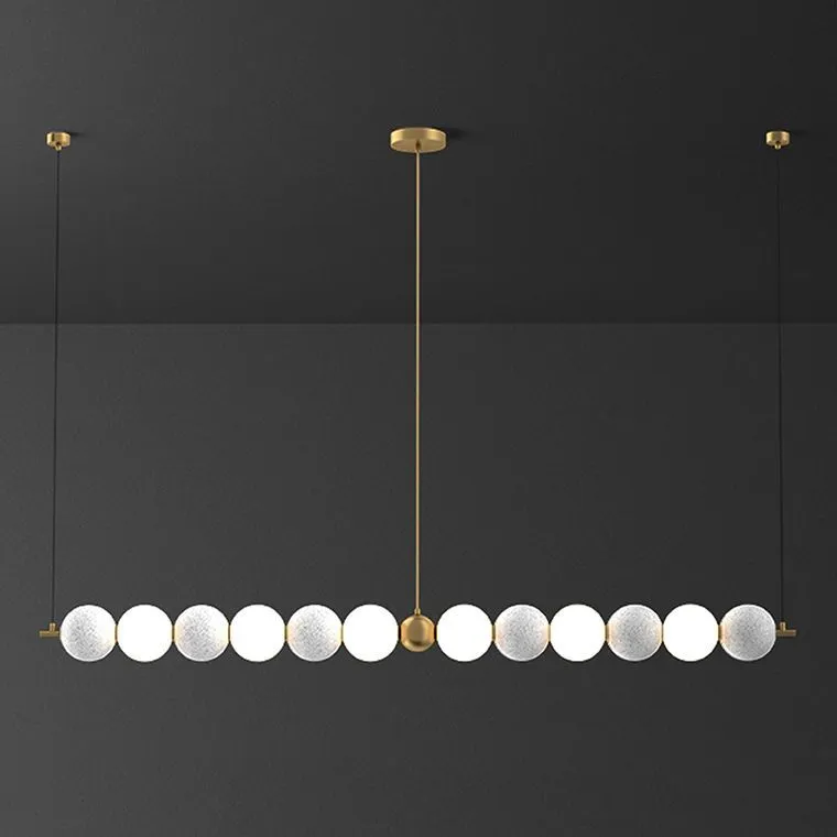 Реечные люстры ANCHAN G доступны в 4 комплектациях: на 8 шаров (4 лампы, размер - 113 х 12 см), на 10 шаров (6 ламп, размер - 137 х 12 см), на 12 шаров (6 ламп, размер - 160 х 12 см), на 14 шаров (8 ламп, размер - 160 х 12 см).