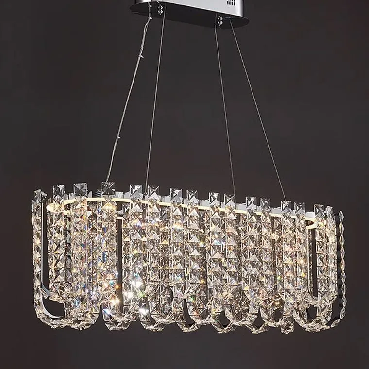 Главным акцентом этих люстр является их хромированный кольцевой корпус, который является не только стильным элементом, но и служит как основа для свисающих хрустальных граненых плашек на элегантных цепочках. Этот уникальный дизайн придает люстре невероятную глубину и привлекательность.