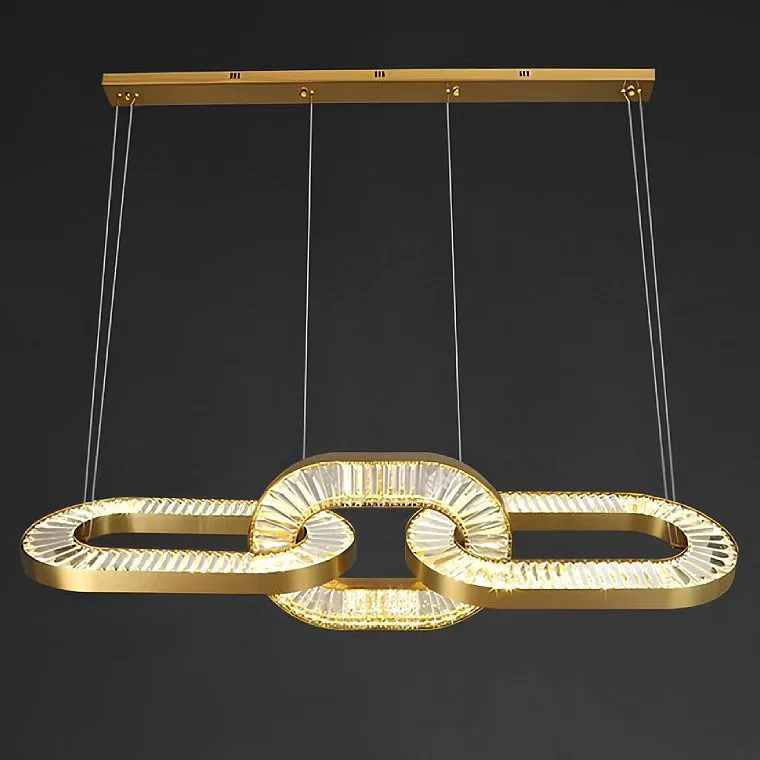Сборка на 3, 4 или 5 колец позволяет вносить разнообразие и индивидуальность в каждое помещение. Металлические овальные каркасы, в которых словно драгоценные камни заключены хрустальные пластины, чередуются по расположению — горизонтально и вертикально. Этот гениальный дизайн создает умопомрачительный визуальный эффект, который очарует каждого, кто войдет в комнату.
