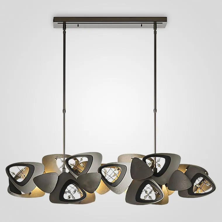 Полые треугольные пластины содержат в себе сверкающие хрустальные камни, надежно закрепленные на металлических стержнях. Каждый хрустальный элемент переливается в лучах света, создавая блестящие отражения, которые заполняют комнату, придавая ей особую атмосферу тепла и уюта.
