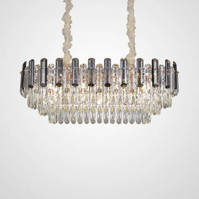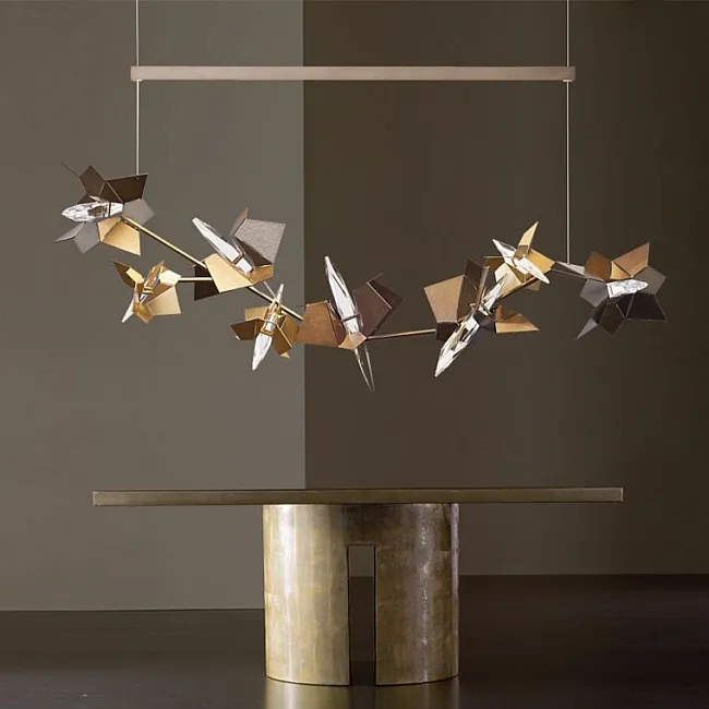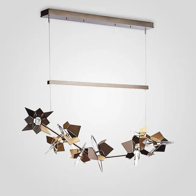 Полые треугольные пластины содержат в себе сверкающие хрустальные камни, надежно закрепленные на металлических стержнях. Каждый хрустальный элемент переливается в лучах света, создавая блестящие отражения, которые заполняют комнату, придавая ей особую атмосферу тепла и уюта.