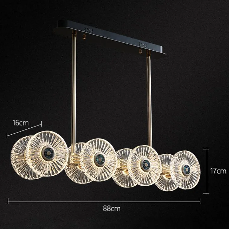 Его латунный глянцевый каркас и черное основание крепежа создают роскошный и притягательный облик, который точно привлечет восхищенные взгляды гостей и коллег. А прозрачные плафоны в форме дисков с натуральными перламутровыми вставками в центре придают светильнику изысканность и изящество.