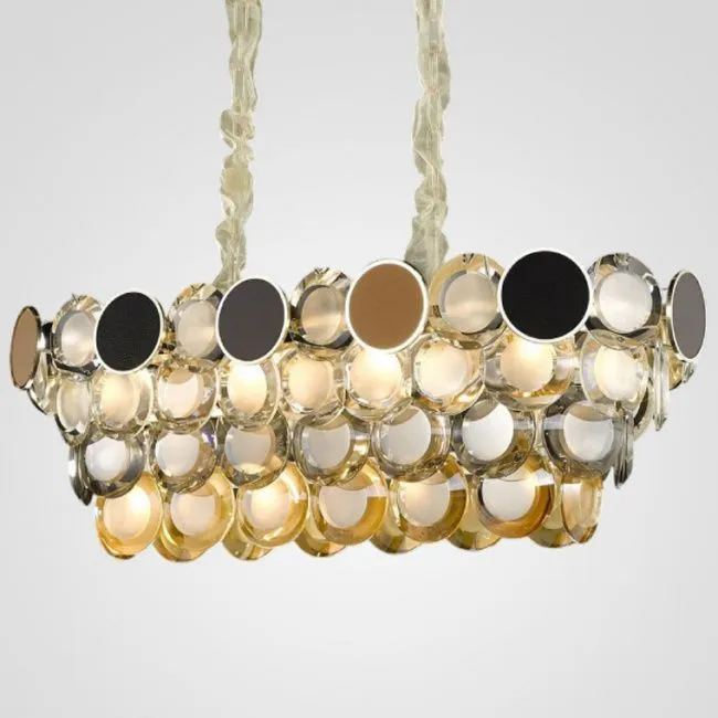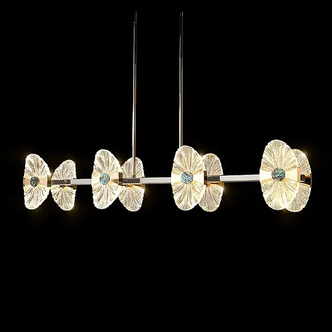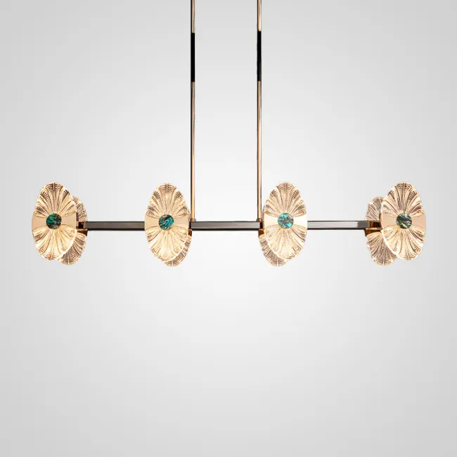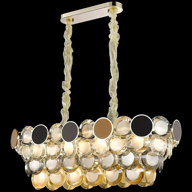 Его латунный глянцевый каркас и черное основание крепежа создают роскошный и притягательный облик, который точно привлечет восхищенные взгляды гостей и коллег. А прозрачные плафоны в форме дисков с натуральными перламутровыми вставками в центре придают светильнику изысканность и изящество.