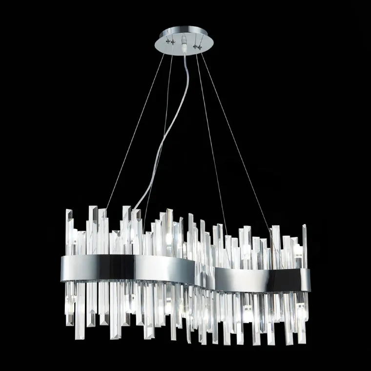 Подарил эту люстру жене, сейчас ремонт делаем в зале, а светильников не было. Супруга рада и я тоже. Всё красиво и на совесть сделано. Производителю респект от меня, на такое не жалко потратится. Форма необычная – изогнутая хромированная дуга с прозрачными пластинками. Включенная люстра хорошо светит, переливается. В общем оценка 5 балов!