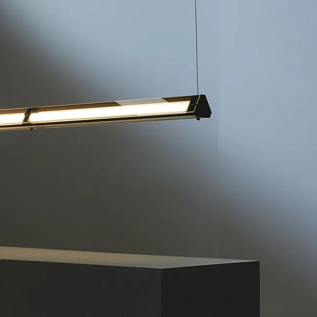 Белый трубчатый рассеиватель из акрила и прямоугольный металлический плафон с лазерной перфорацией добавляют изделию нотку футуристичного дизайна.