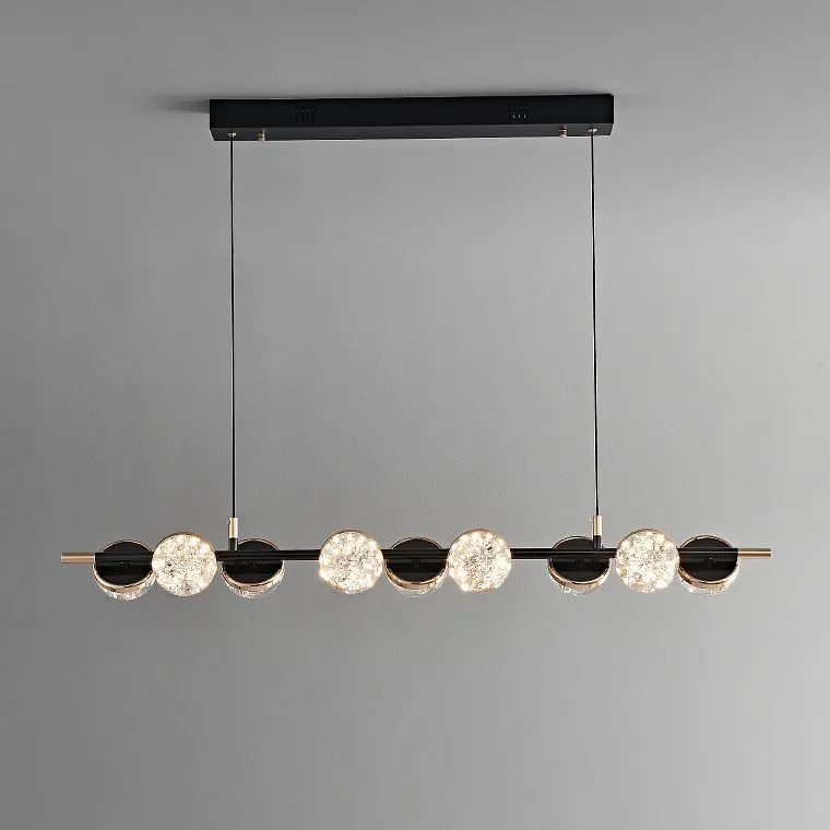 Корпус светильника выполнен в элегантном минималистичном стиле, сочетающем глубокий черный и роскошное золото. Это комбинированное решение придает светильнику современный и утонченный вид, делая его идеальным дополнением к любому интерьеру. Полусферические плафоны из прозрачного акрила с детализированным эффектом льда добавляют интерьеру свежести и легкости, создавая уютную атмосферу в вашем доме.