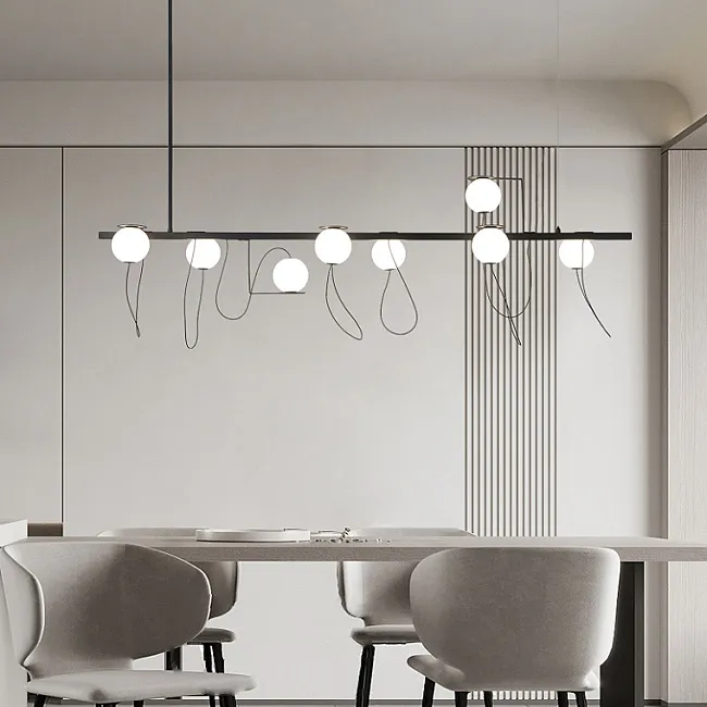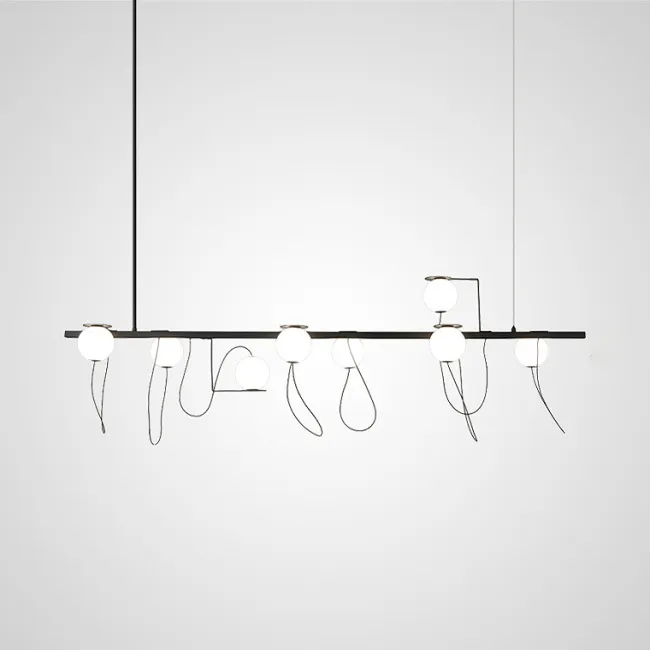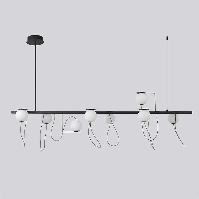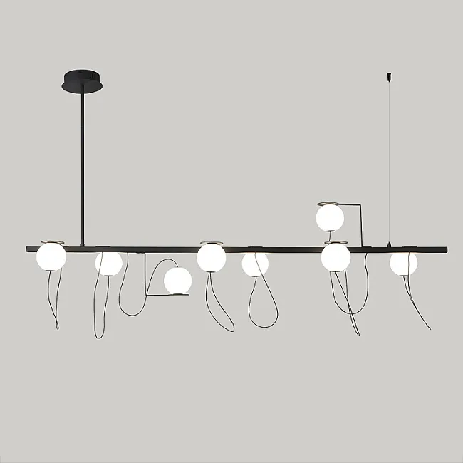 Все изогнутые рассеиватели «Flame Wave» выполнены из латуни, что придает им благородный вид и добавляет шарма всей конструкции. Черный корпус и струнный подвес усиливают эффект элегантности и современности, делая эти люстры идеальным решением для гостиной или кухни.