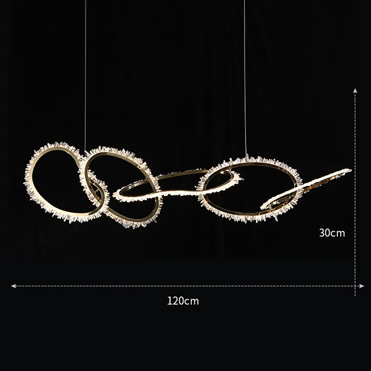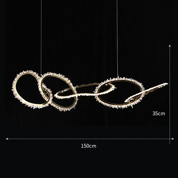 Светодиодная инсталляция в виде пересекающихся колец различной формы на струнном подвесе с натуральными хрустальными камнями на внешнем контуре