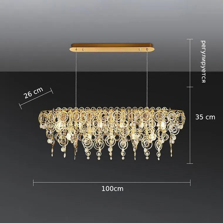 Реечный светильник в виде комбинации колец и хрустальных подвесок на металлическом каркасе