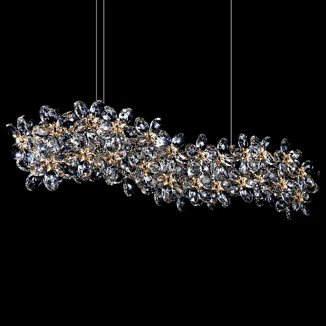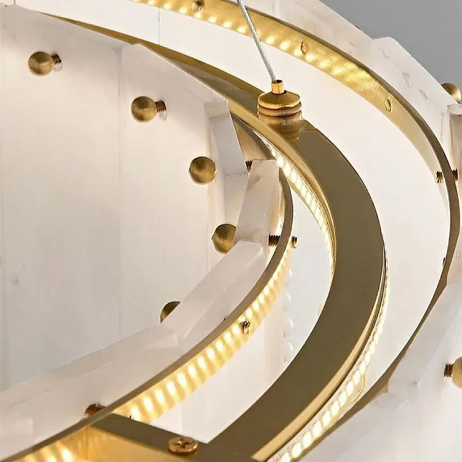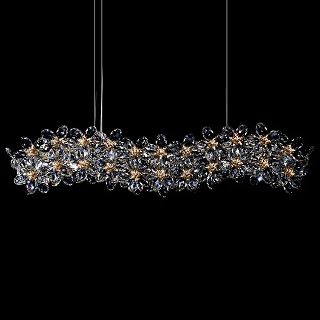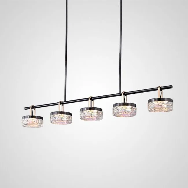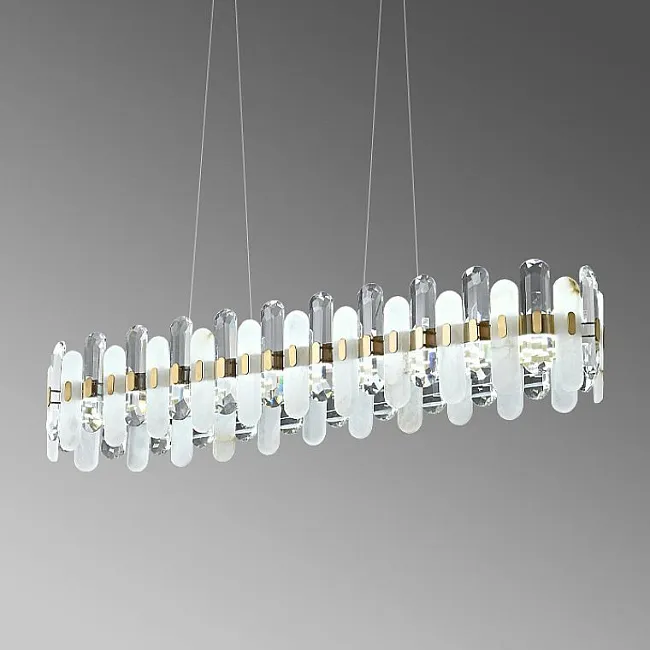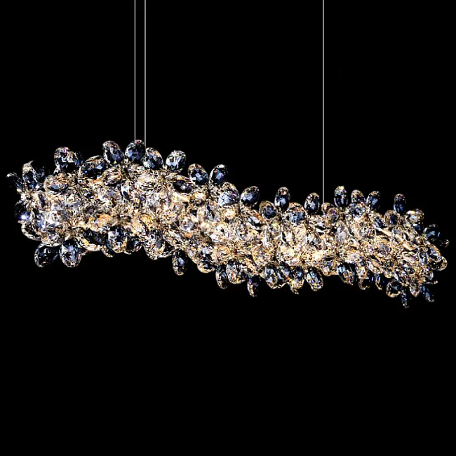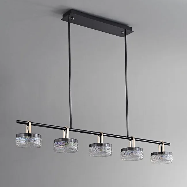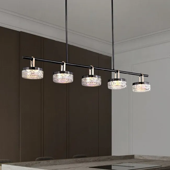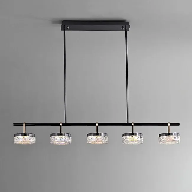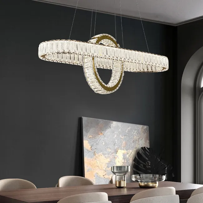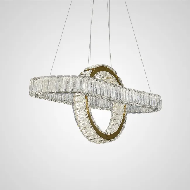 Реечный светильник в виде комбинации колец и хрустальных подвесок на металлическом каркасе