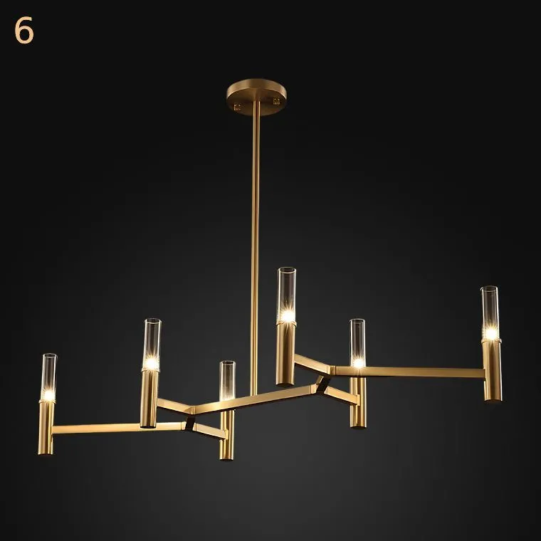 Сияющие стеклянные плафоны цилиндрической формы великолепно сочетаются с разветвленным каркасом, создавая неповторимый образ, который привлекает взгляды и уносит в мир роскоши. Латунный корпус, с его молекулярной формой, восхищает своей изысканностью и придает люстре особый шарм.