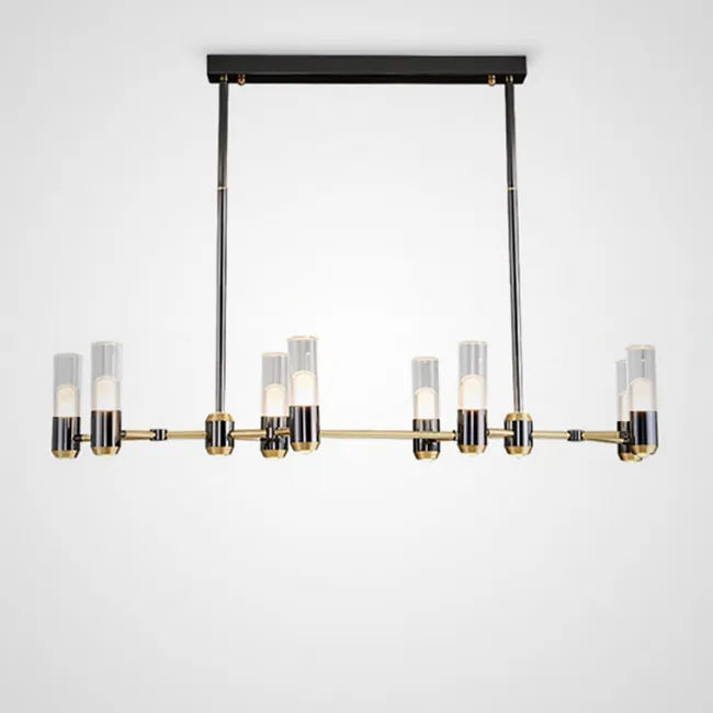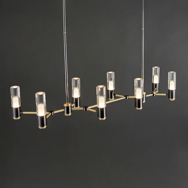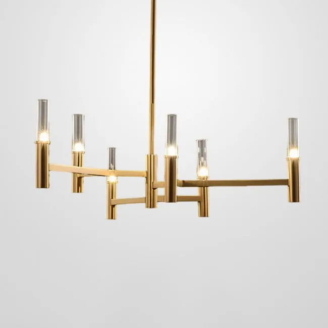 Сияющие стеклянные плафоны цилиндрической формы великолепно сочетаются с разветвленным каркасом, создавая неповторимый образ, который привлекает взгляды и уносит в мир роскоши. Латунный корпус, с его молекулярной формой, восхищает своей изысканностью и придает люстре особый шарм.