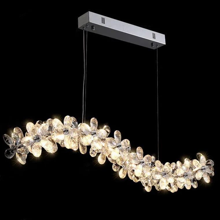 Каждый цветок состоит из ограненных хрустальных капель, которые обладают уникальной "морозной" текстурой внутри. Этот особый эффект добавляет люстрам особую красоту и изысканность. В сердцевине каждого цветка находится декоративный цветок, повторяющий основной цветок. Это создает гармоничное и эстетически привлекательное сочетание.