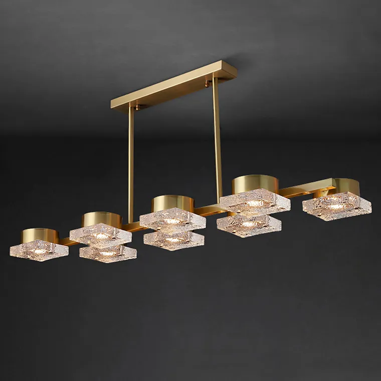 Реечная люстра в минималистичном стиле с сочетанием круглых крепежных элементов и квадратных рассеивателей с имитацией водной ряби на стекле