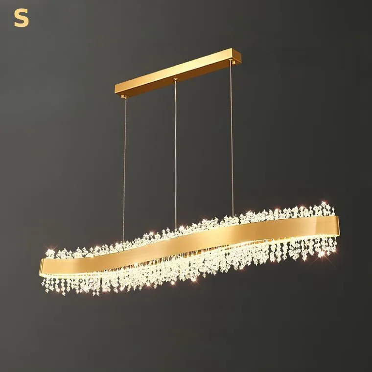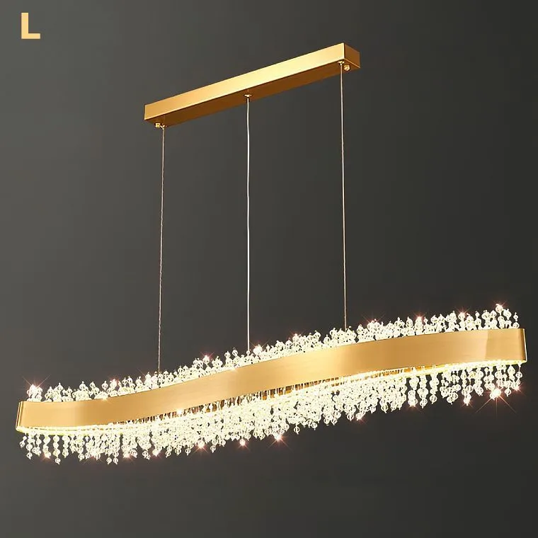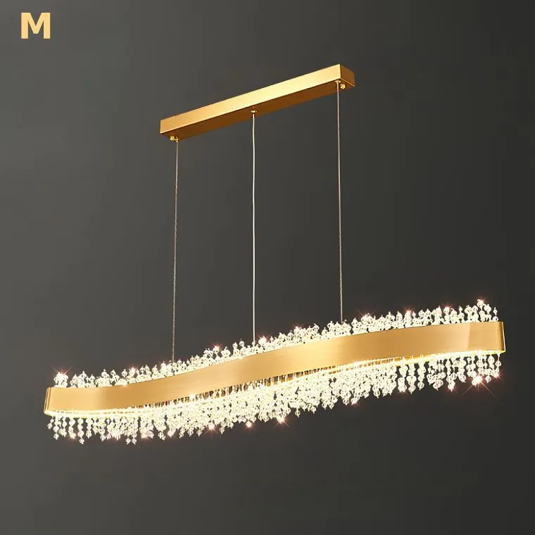 Изогнутый волнообразный корпус латунного цвета напоминает струящуюся реку, и подчеркнут струнными подвесами, которые позволяют легко регулировать высоту расположения светильника, создавая идеальное освещение для любого случая. LED-подсветка обеспечивает мягкий и ровный свет, который мягко окутывает комнату, даря уют и создавая атмосферу комфорта.