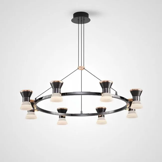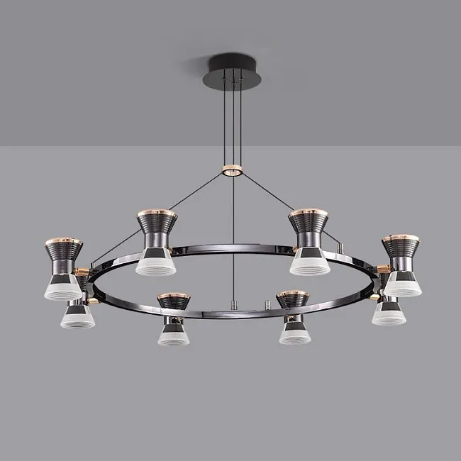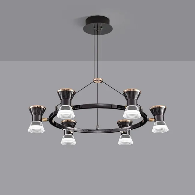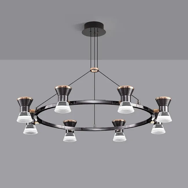 Она словно воплощение утонченного вкуса и безупречной техники. Особенность этой люстры — изящные поворотные плафоны в форме песочных часов. С одной стороны, они погружены в роскошный жемчужно черный цвет с тонкими золотыми вставками, а с другой — излучают мягкость и тепло белого рассеивателя. Их угол поворота в 360 градусов дарит вам свободу выбора в направлении светового потока. Нужен яркий акцент на опредёленную зону или мягкое общее освещение? С этими плафонами возможно всё! В любом случае, с этой люстрой вы получаете двунаправленный световой поток.