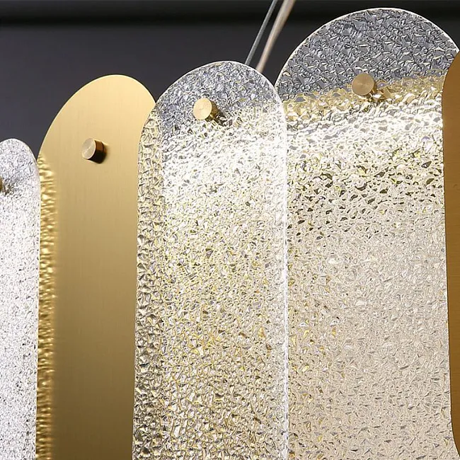 Каркас в роскошном золотом цвете в сочетании с миксом рассеивателей из серо дымчатого стекла и стильных металлических латунных пластин буквально наводит волшебство в воздухе. Рассеиватели, расположенные в два ряда, создают захватывающий эффект слоев, который выглядит гламурно и современно.
