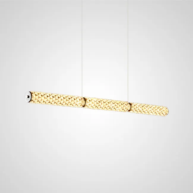 NICOL LONG мгновенно преобразит ваше пространство и добавит роскоши в любой интерьер. На прочной латунной стойке гармонично расположилась поперечная штанга, на которой закреплены четыре рельефных подвесных плафона. Эти эллиптические плафоны вызывают ассоциации с драгоценными камнями, создавая атмосферу утонченности и элегантности. Верх и низ каждого плафона обрамлен латунной вставкой, что добавляет ещё больше изящества и привлекательности.