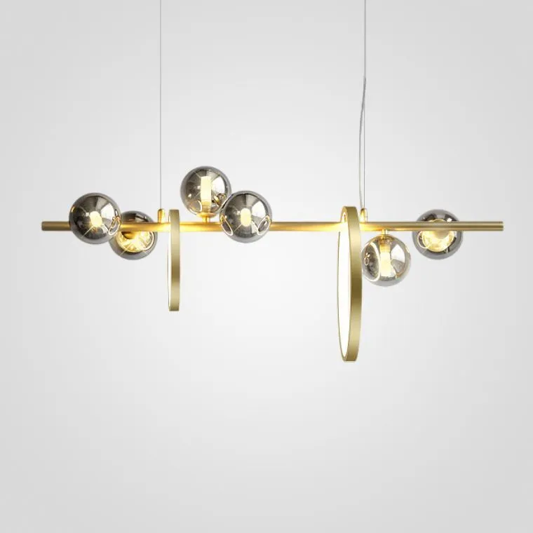 Серия реечных светильников с дымчатыми шарообразными плафонами из стекла, чередуемые кольцами разного диаметра с внутренней LED-подсветкой