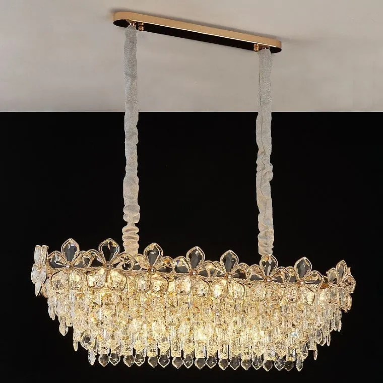Люстра для столовой зоны с декором в виде хрустальных цветов и подвесок на металлическом каркасе