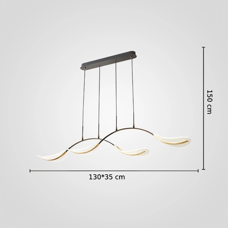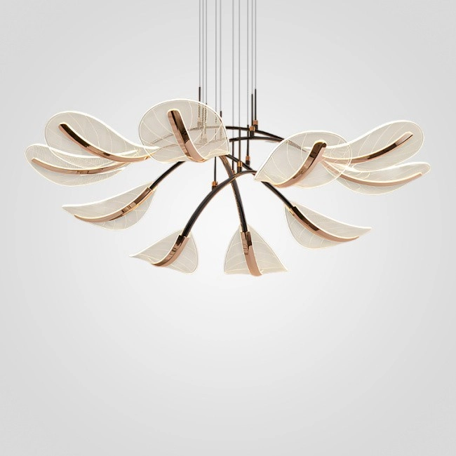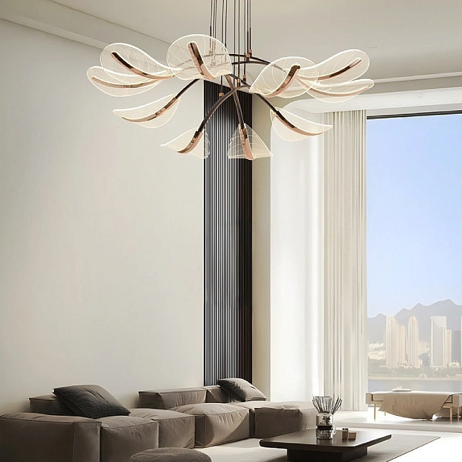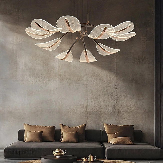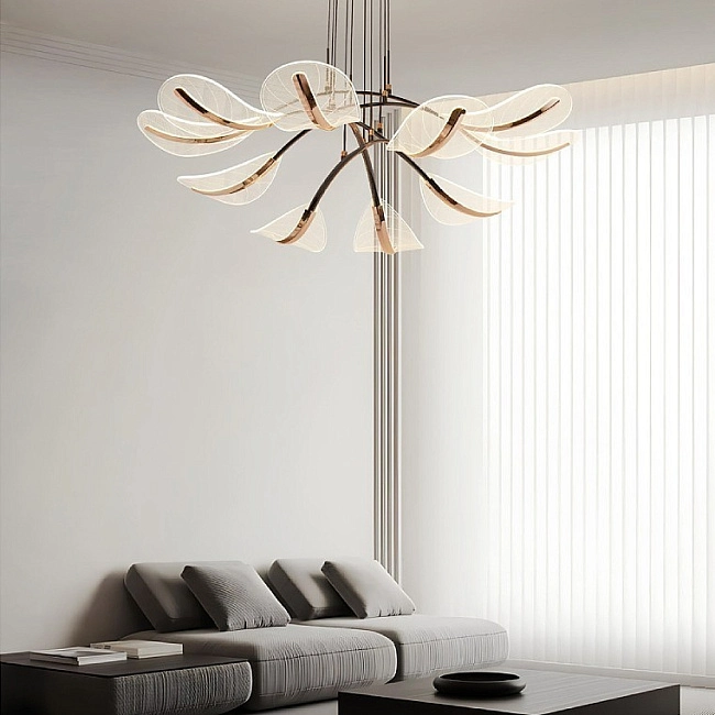 Реечная люстра в виде композиции из дугообразных металлических реек с полупрозрачными рассеивателями, напоминающими перья