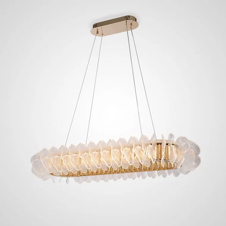 Каждая люстра в этой серии имеет струнный подвес и впечатляющий золотой каркас, который добавляет изысканности и роскоши к любому помещению. Кольцевые формы обеспечивают равномерное распределение света по всему пространству, создавая мягкий и приятный свет, который отражается от акриловых лепестков, придавая им прекрасный блеск.