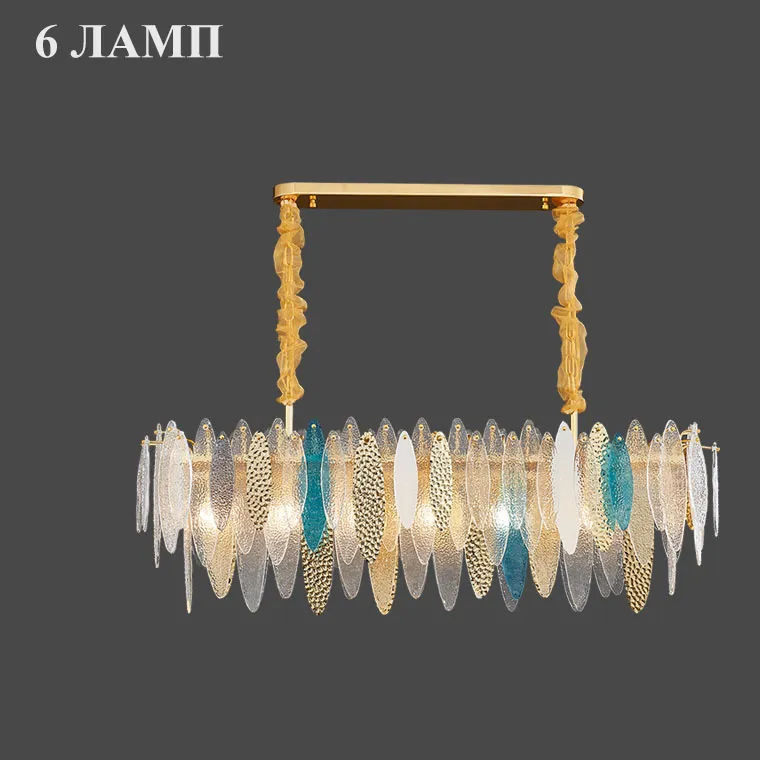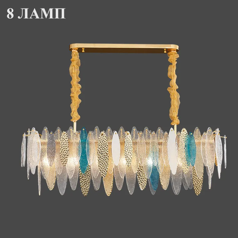 Реечный светильник со стеклянными прозрачными подвесками лепестками, голубыми и белыми вставками с фигурной поверхностью