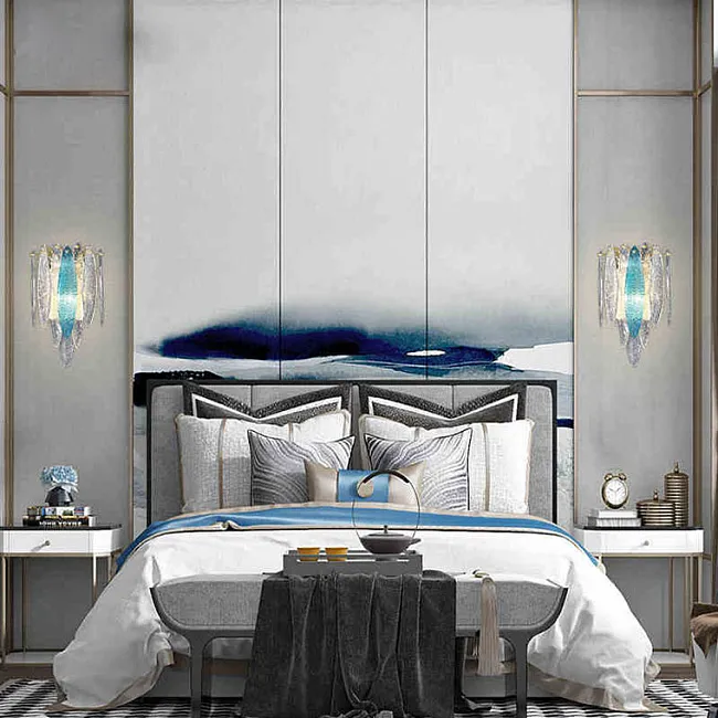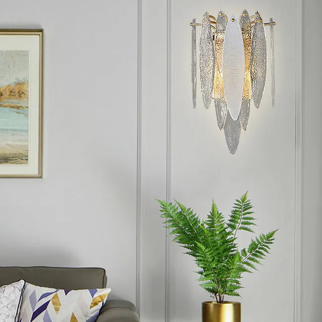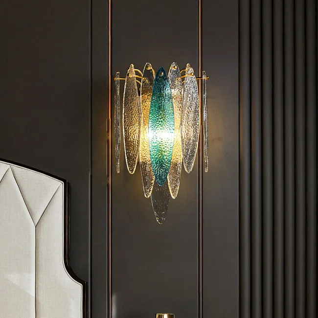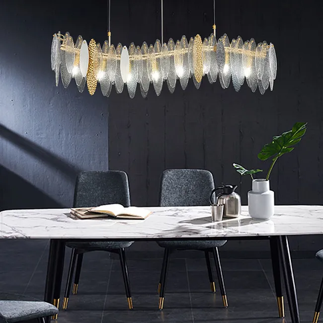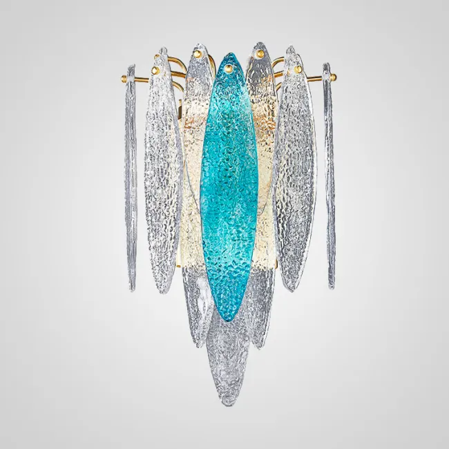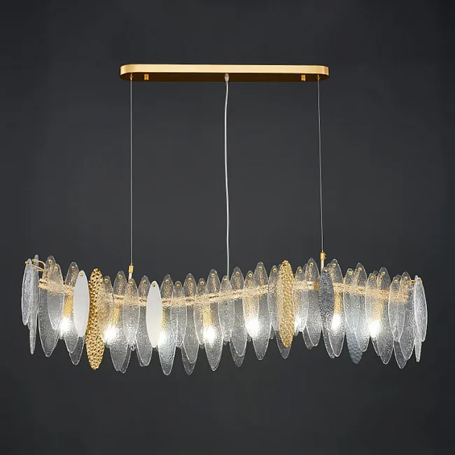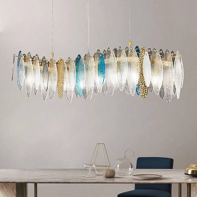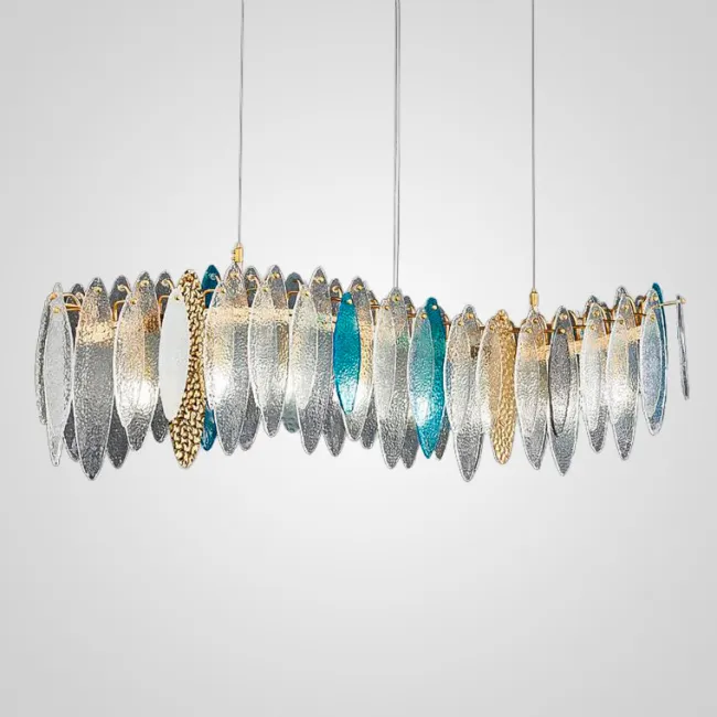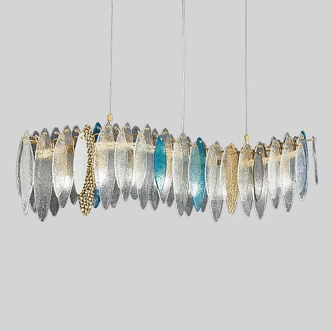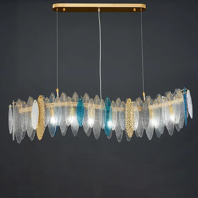 Реечный светильник со стеклянными прозрачными подвесками лепестками, голубыми и белыми вставками с фигурной поверхностью