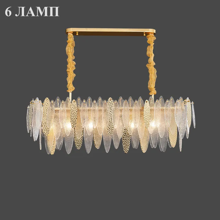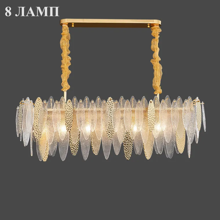 Реечный светильник со стеклянными прозрачными подвесками лепестками, золотыми вставками с фигурной поверхностью