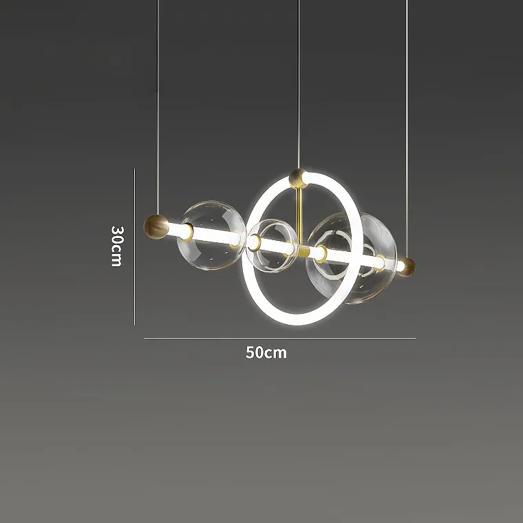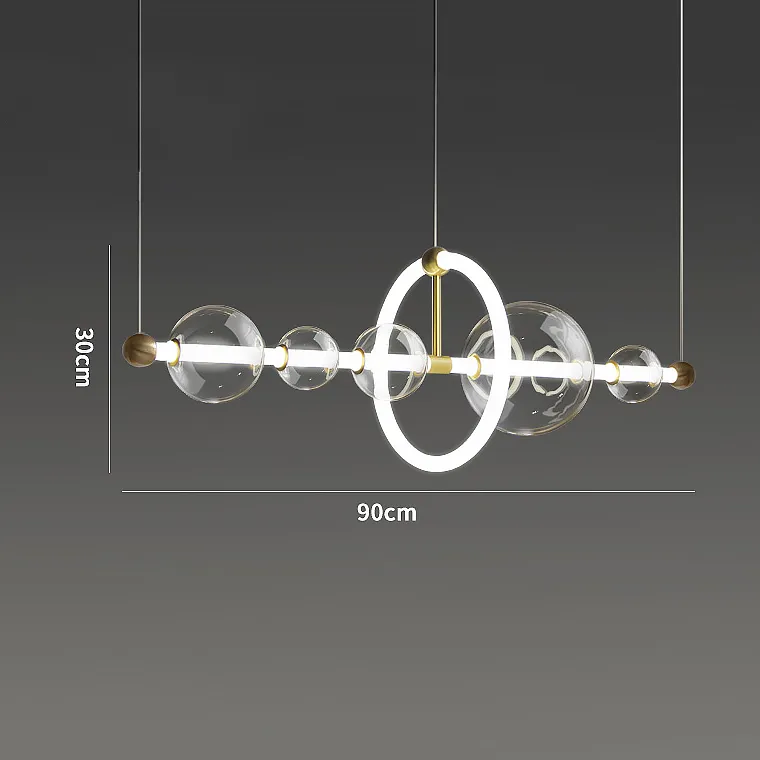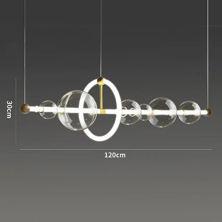 Реечный светильник с плафонами шарами разного диаметра и светодиодным кольцом в центре
