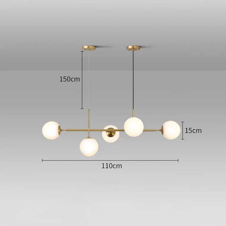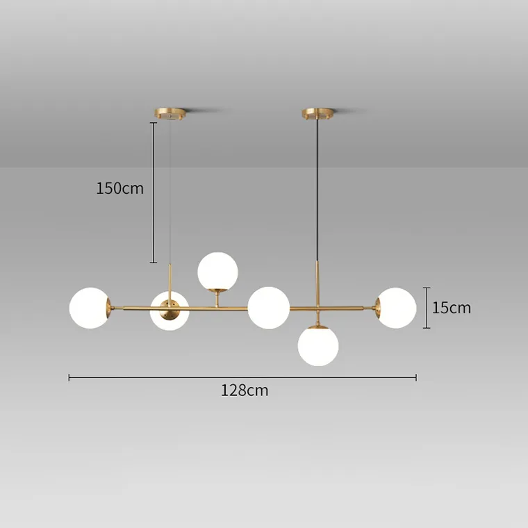SIMMA имеет рядные светильники с молочно-белыми шарообразными плафонами, которые создают приятный и комфортный свет в вашей гостиной или столовой. Цвет каркаса люстры - латунь, придает ей благородство и элегантность. Размеры люстры - 128 x 150 см, делая ее идеальной для средних и больших комнат.