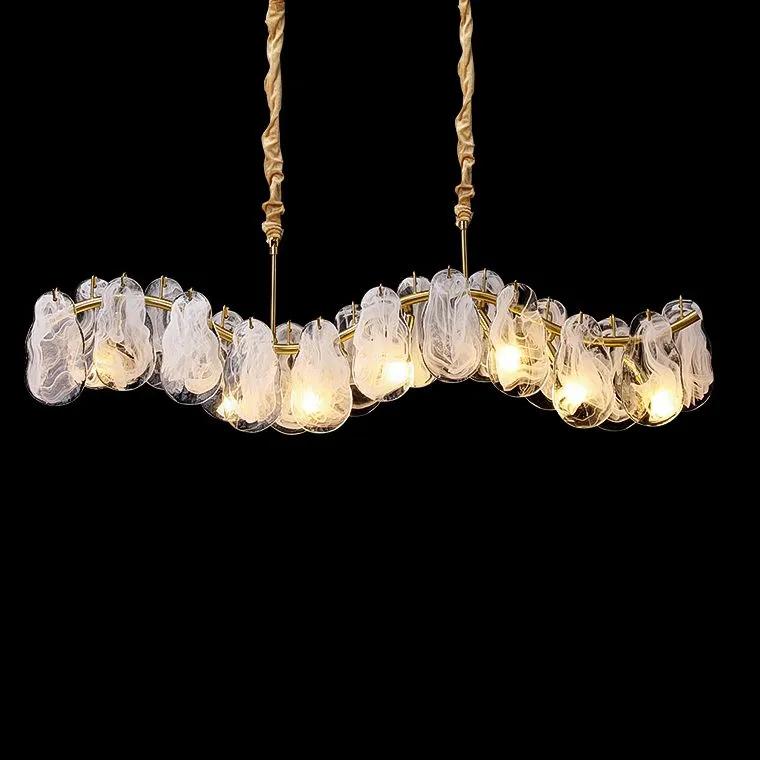 Светильник имеет волнообразный корпус из латуни, который создает эффект движения и добавляет неповторимости в его дизайн. Стеклянные подвески выполнены в виде листьев и создают декоративный эффект "белый дым". Этот необычный эффект придает светильнику особый шарм, делая его неповторимым и привлекательным.