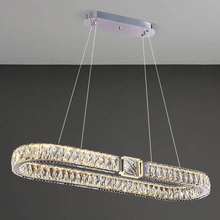 Светодиодный удлиненный овальный светильник с рассеивателями из хрусталя. Светильник овальной формы с рассеивателями из хрусталя – это элегантное и изысканное решение для проведения освещения в гостиной или больших залах. Современный и стильный дизайн этого светильника сочетает в себе хромированный корпус и роскошные хрустальные акценты.