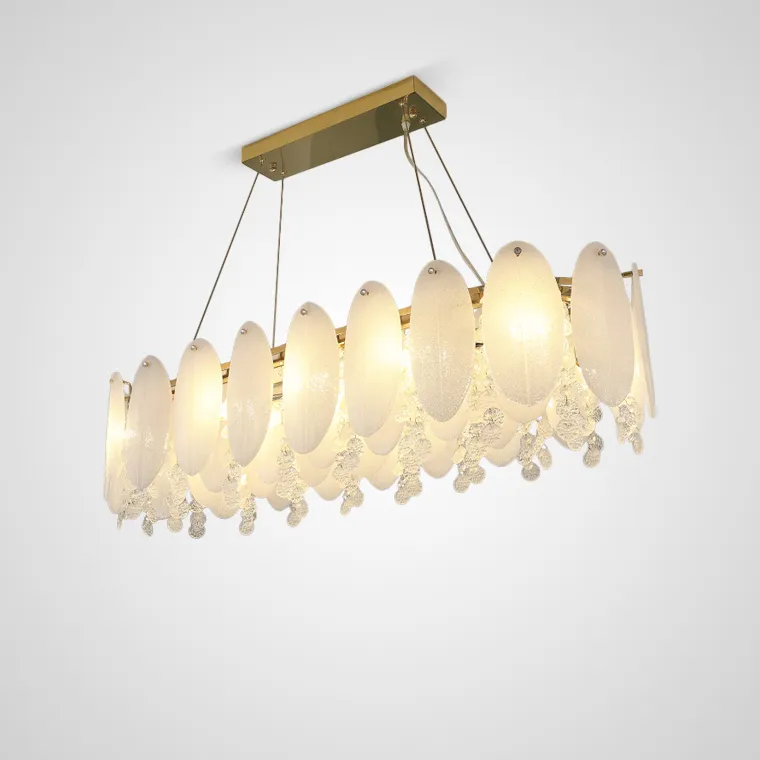 Реечный светильник с абажуром из дисковидных рельефных подвесок и стеклянных пластин миндалевидной формы