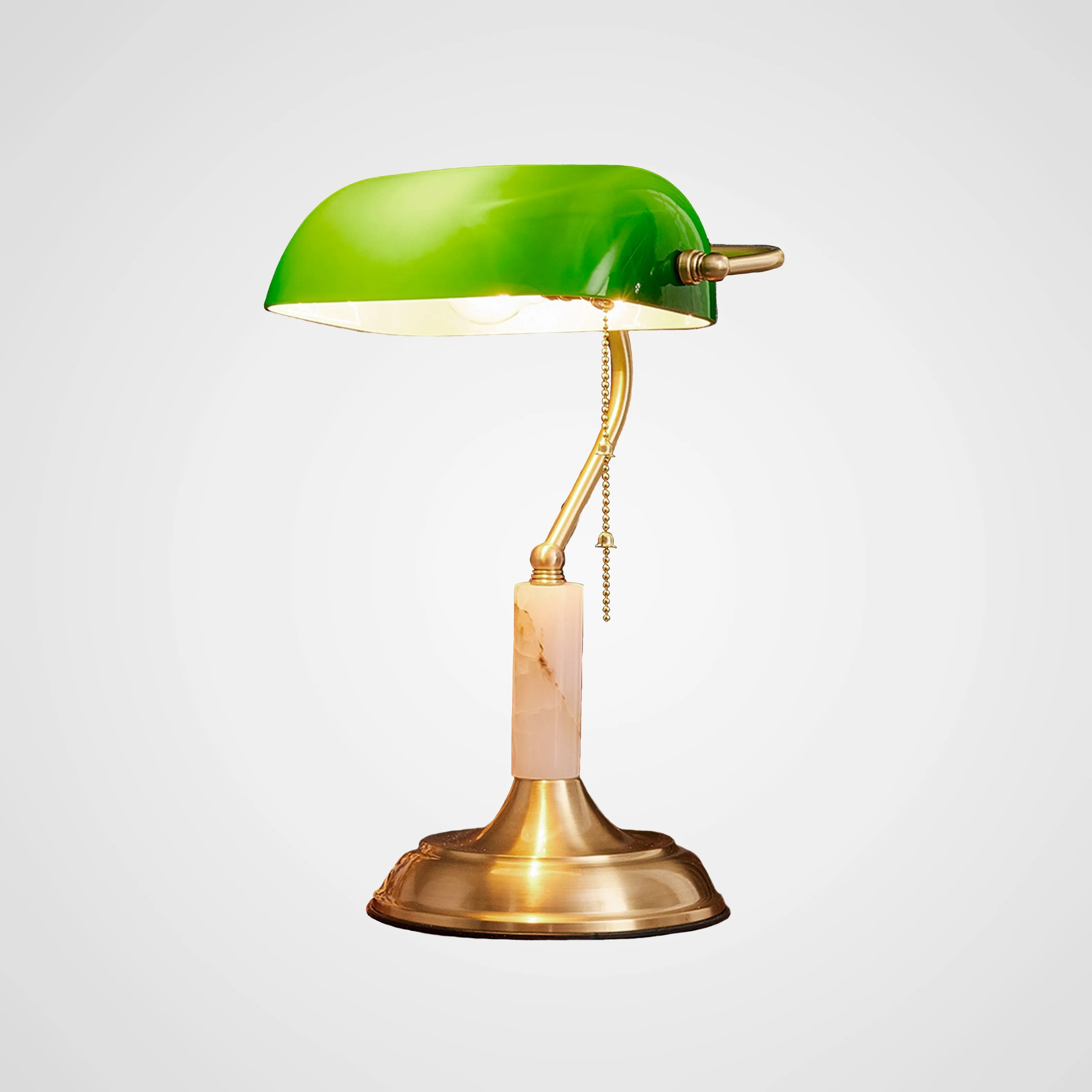 Лампа BANKER с цоколем Е27 оснащена зеленым плафоном, выполненным в стиле ретро, и сонетным выключателем. Эта модель имеет два варианта дизайна - классический и с ониксовым основанием. Размер плафона - 24х26 см, а высота лампы - 40 см.