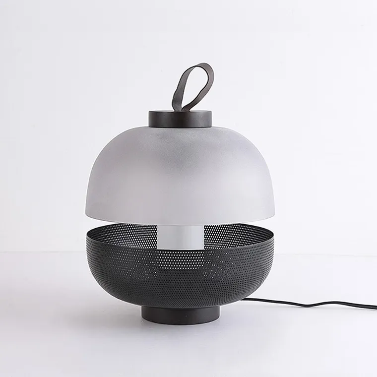 Настольный светильник с составным абажуром из металлической сетки и матового стекла с декоративной петлей сверху