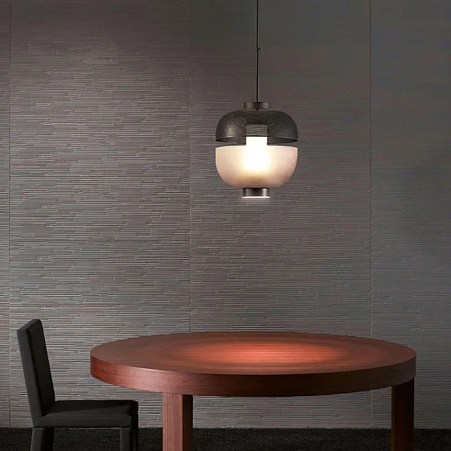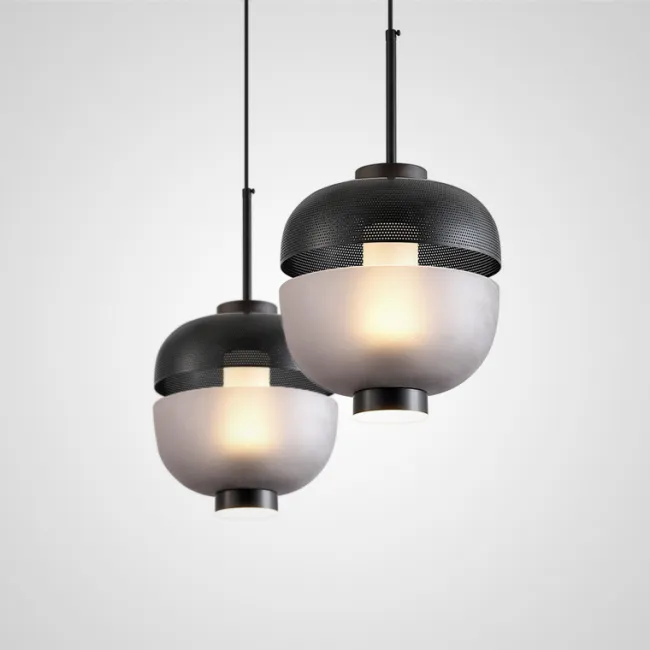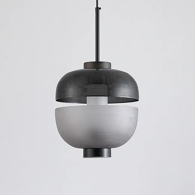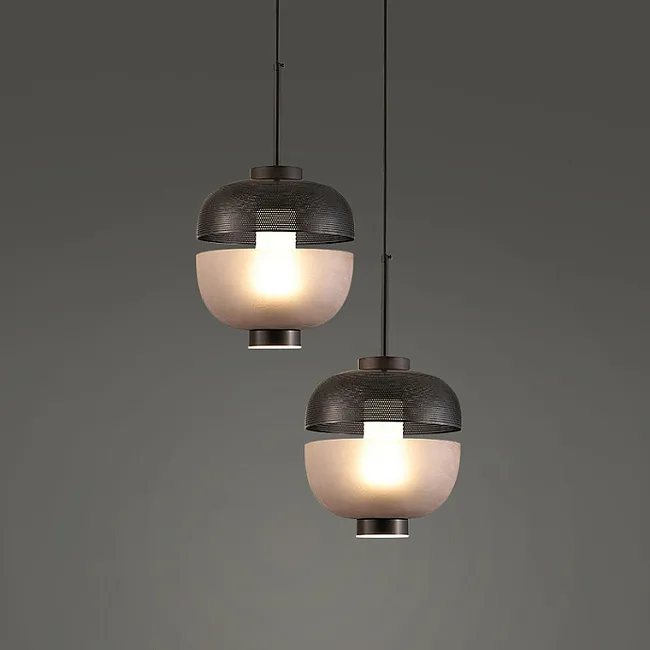 Настольный светильник с составным абажуром из металлической сетки и матового стекла с декоративной петлей сверху