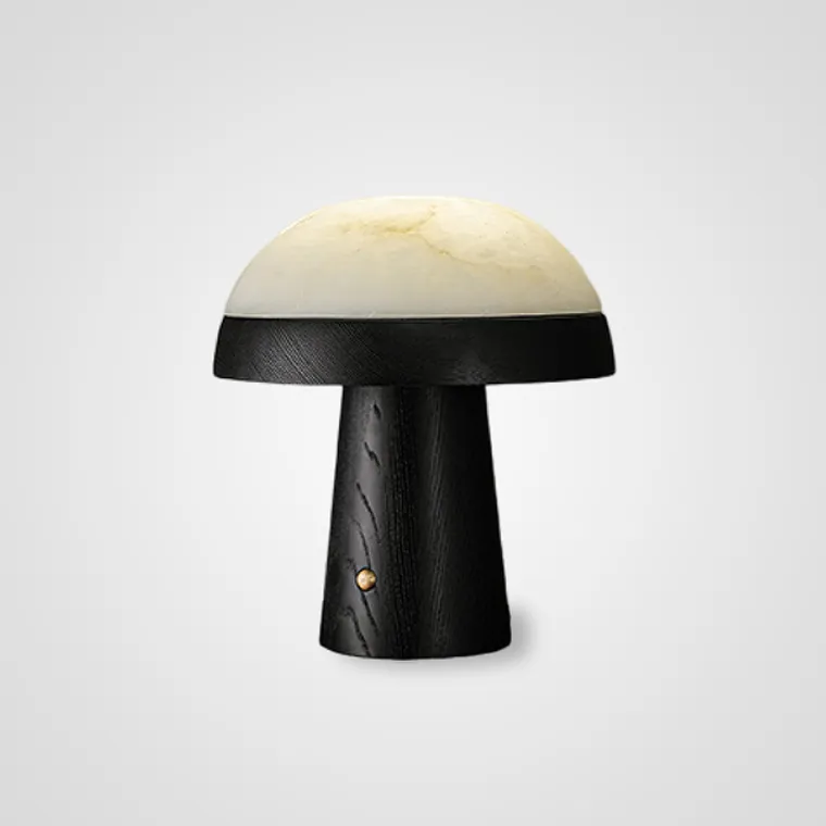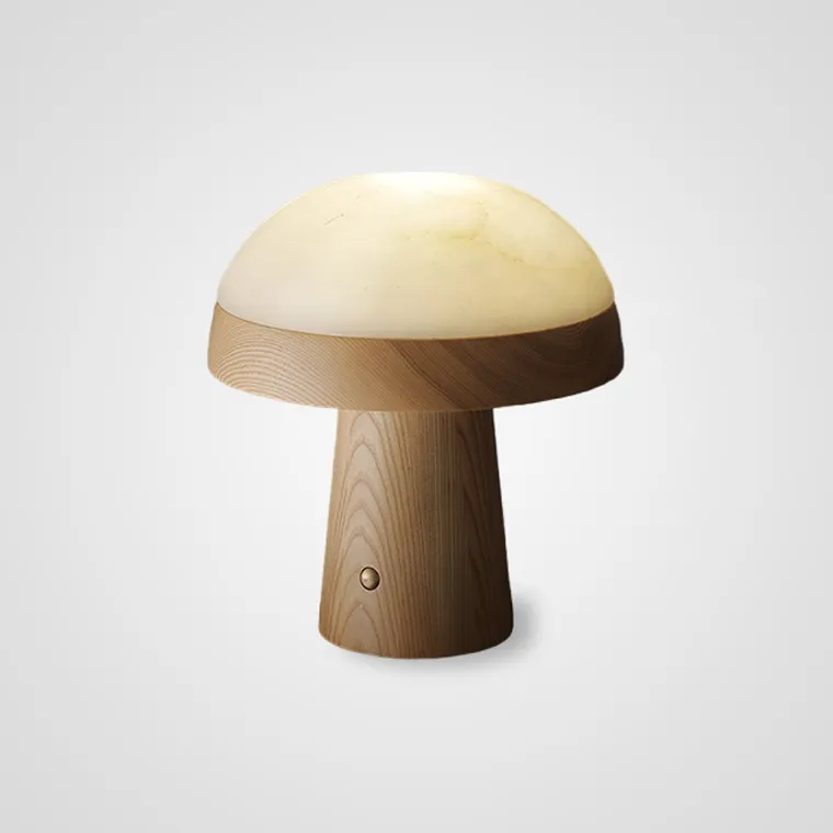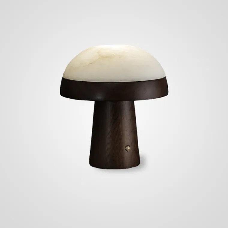 Настольная лампа из массива дерева с мраморным плафоном в форме купола и сенсорным переключателем на корпусе