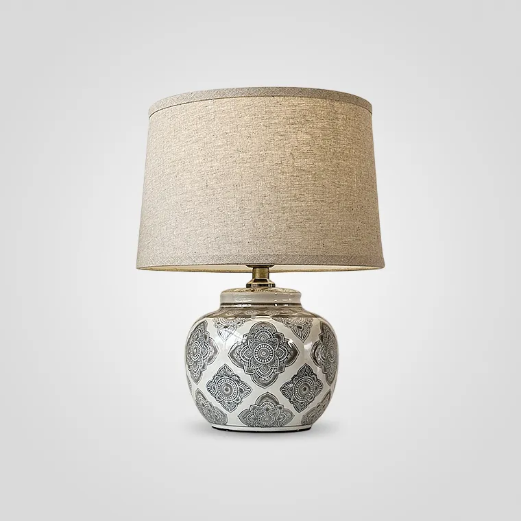 Настольная лампа с керамическим основанием, украшенным орнаментом, и тканевым абажуром цилиндрической формы в пасторальном стиле
