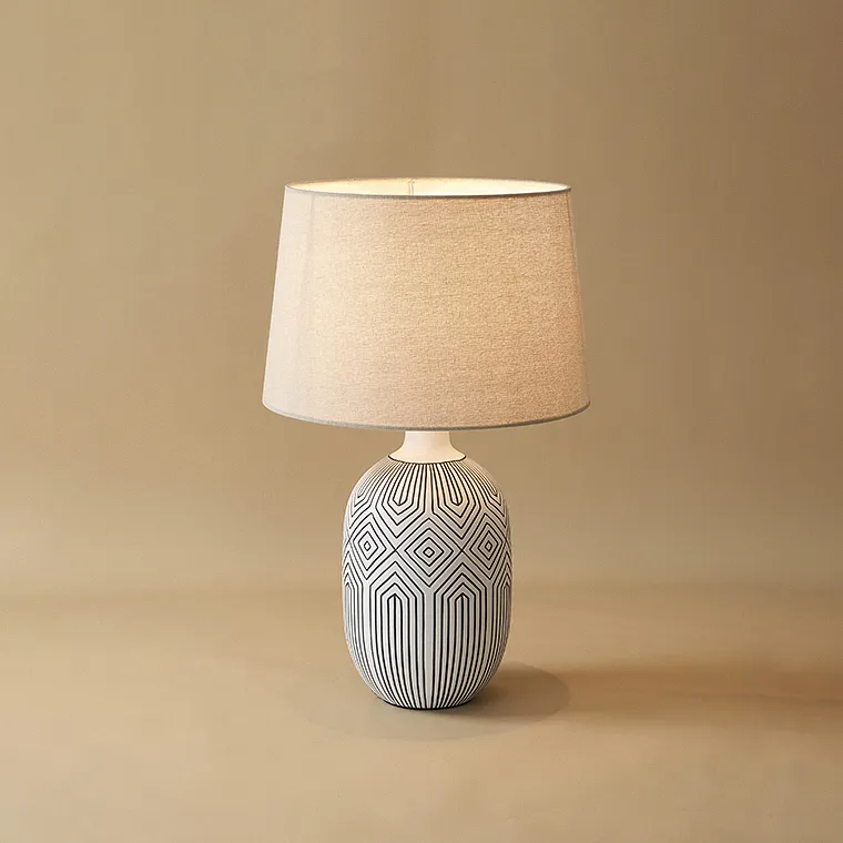 Настольная лампа с геометрическим узором на основании и текстильным бежевым абажуром, в стиле японской ретро лампы