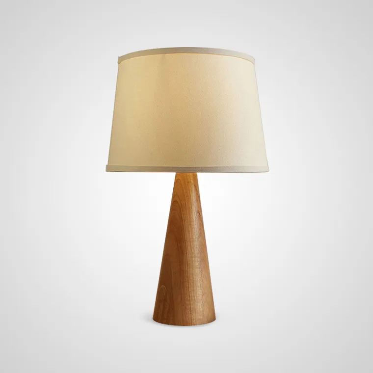 Настольный светильник с трапециевидным текстильным абажуром на коническом основании из цельного дерева
