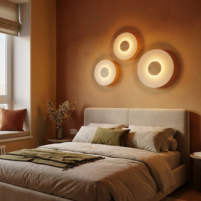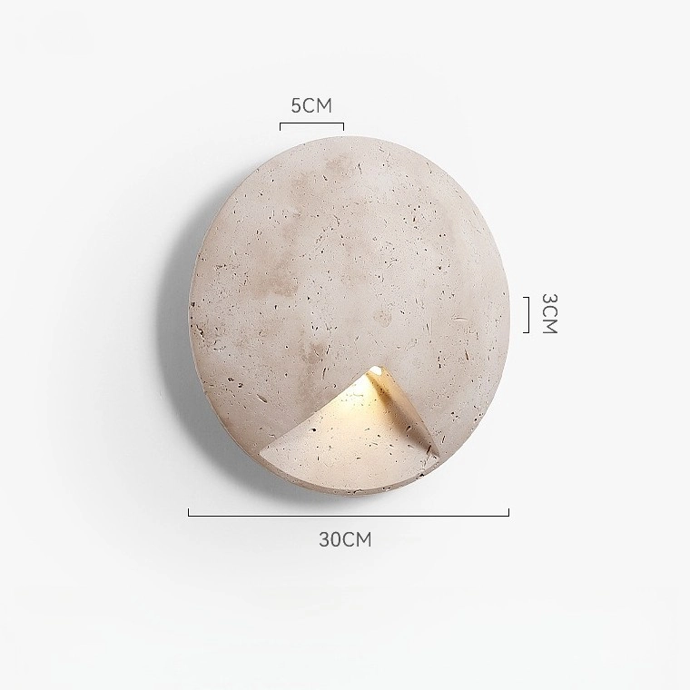 Настенный светильник в виде выпуклого диска из натурального травертина с точечным источником света в треугольном вырезе на корпусе