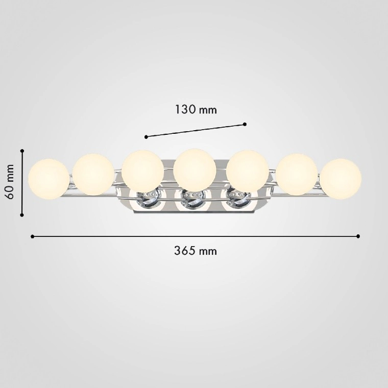 Настенный хромированный светильник с рядом шарообразных белых плафонов в виде фар