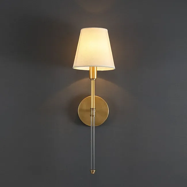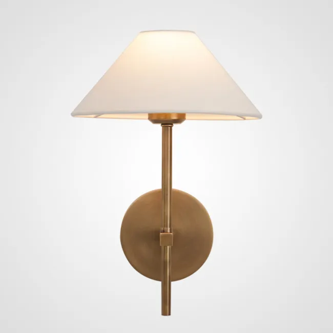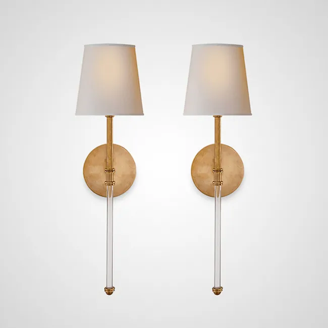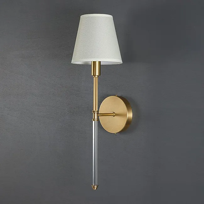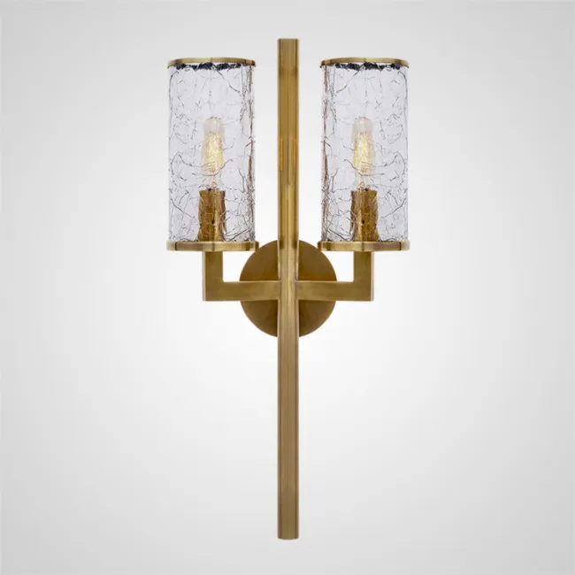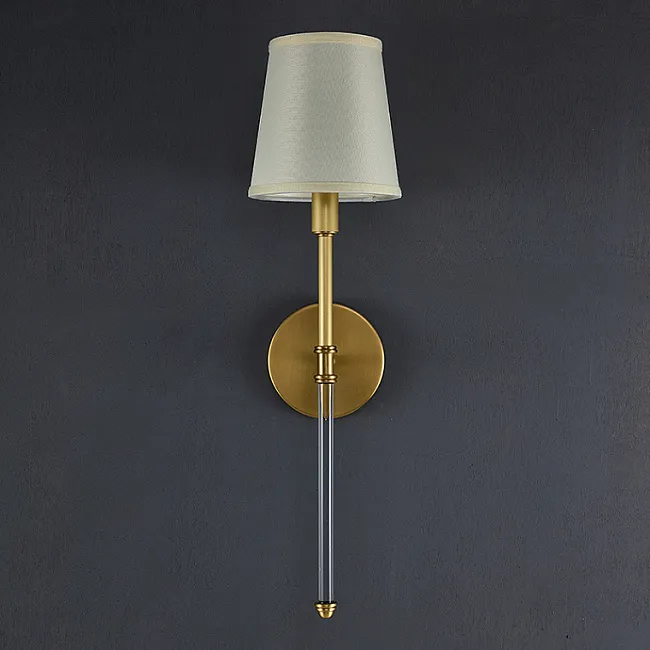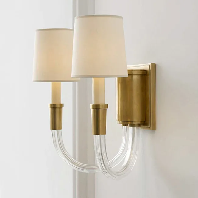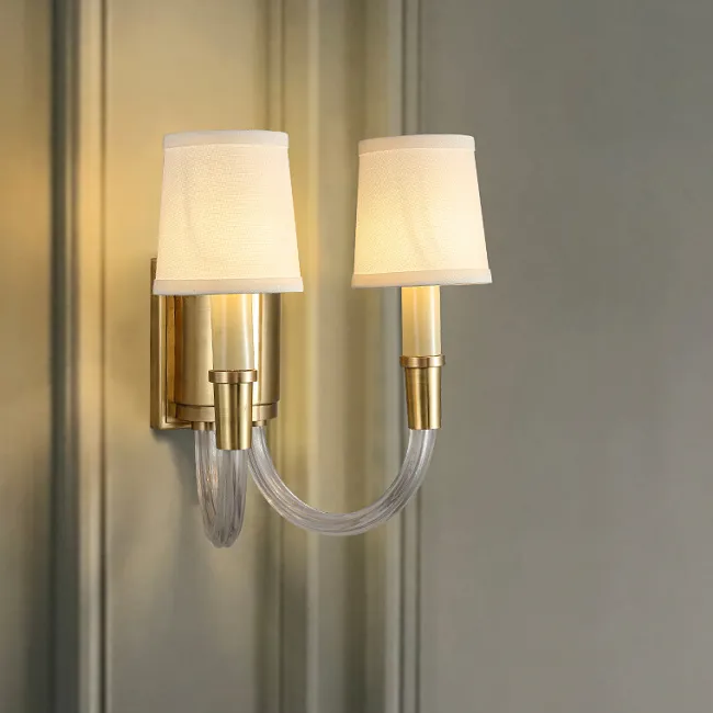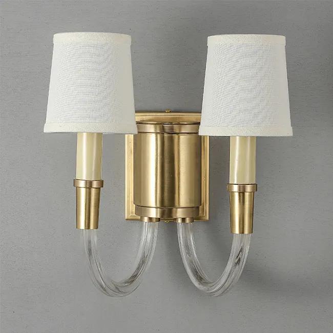 Настенный светильник с двумя цилиндрическими текстильными абажурами на латунной стойке