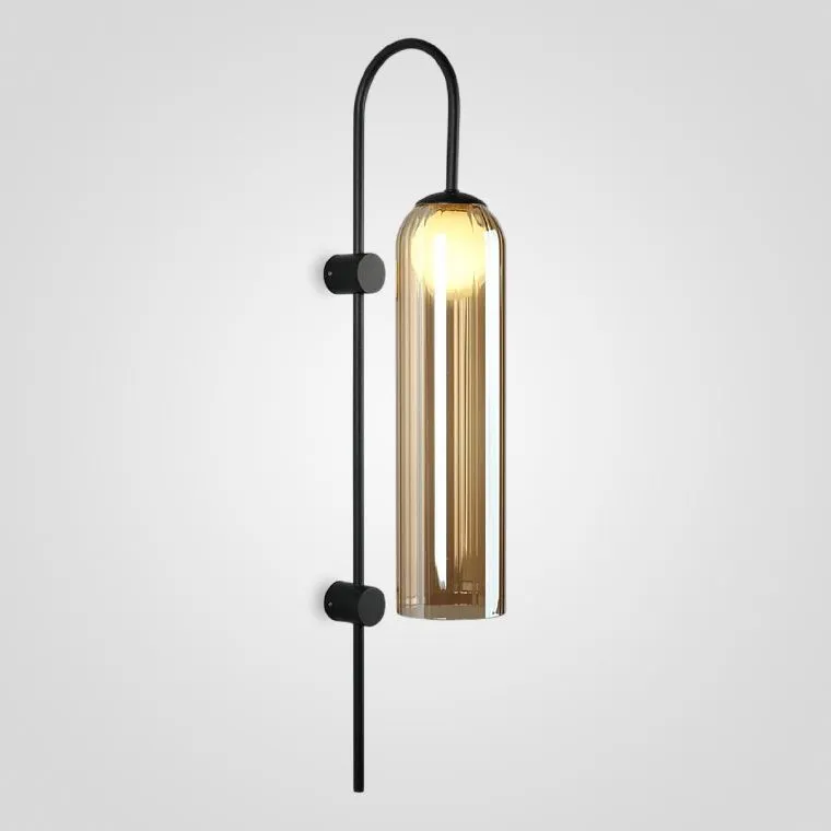 Современное настенное бра с изогнутым металлическим каркасом в черном цвете и вытянутым плафоном из стекла коньячного цвета