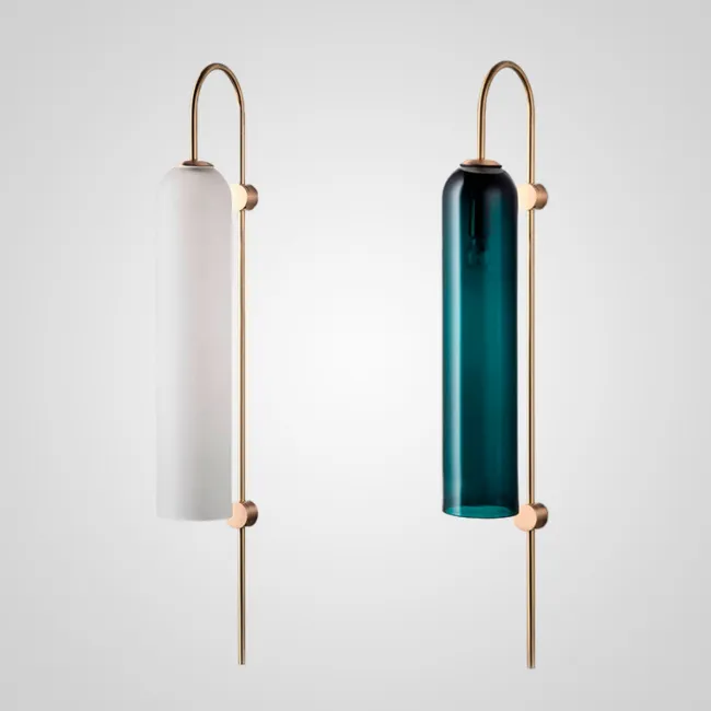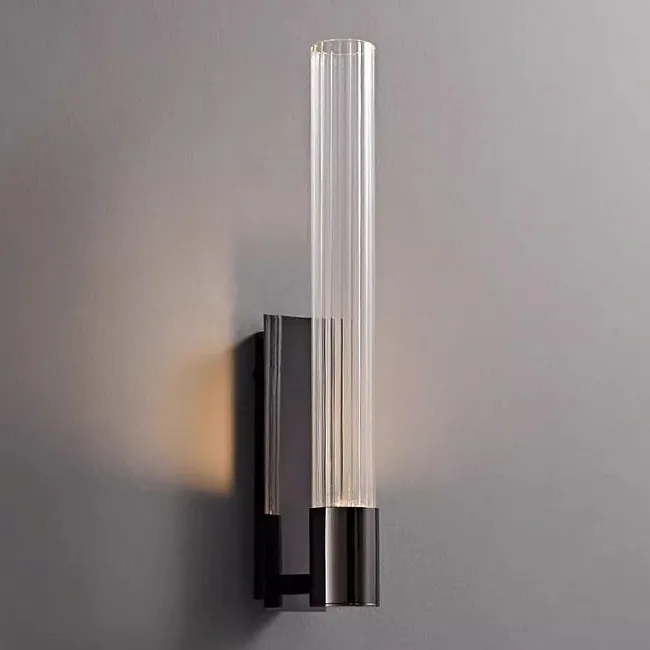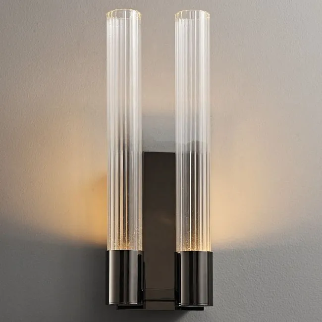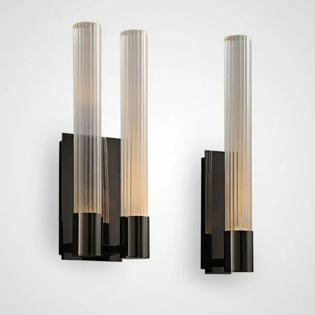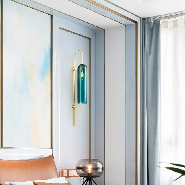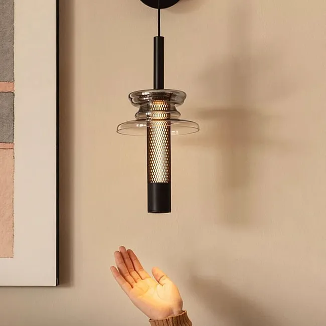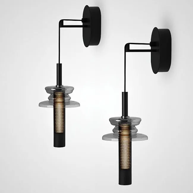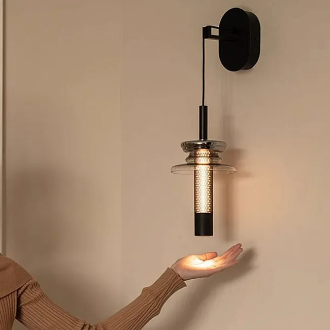 Современное настенное бра с изогнутым металлическим каркасом в черном цвете и вытянутым плафоном из стекла коньячного цвета