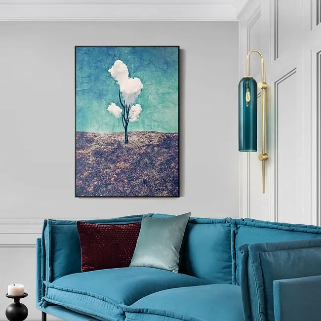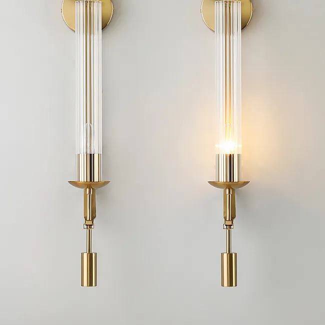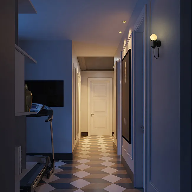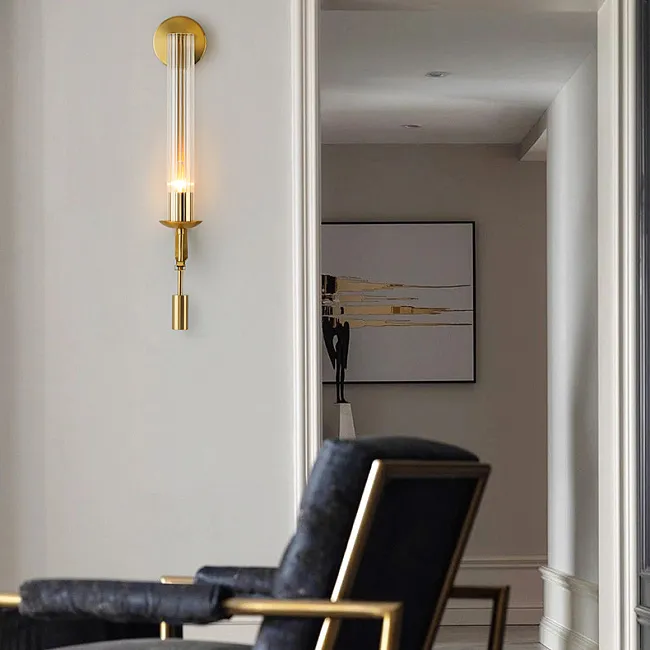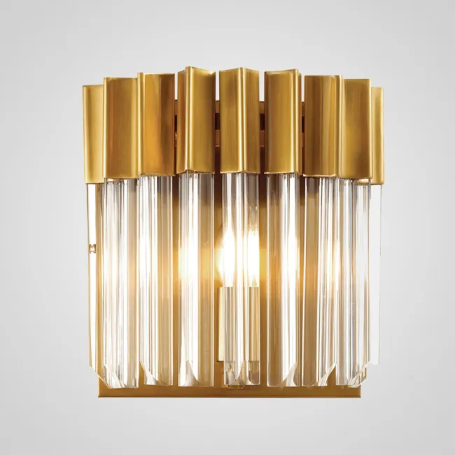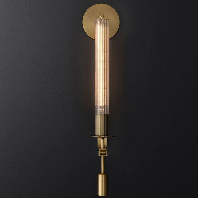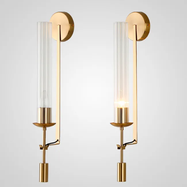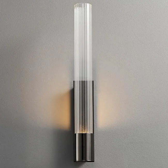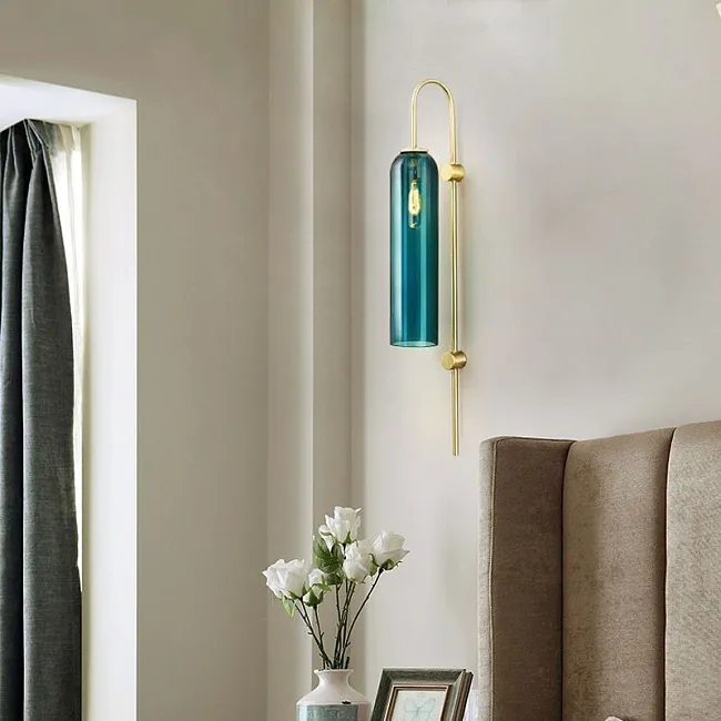 Современное настенное бра с изогнутым металлическим каркасом в черном цвете и вытянутым плафоном из стекла коньячного цвета