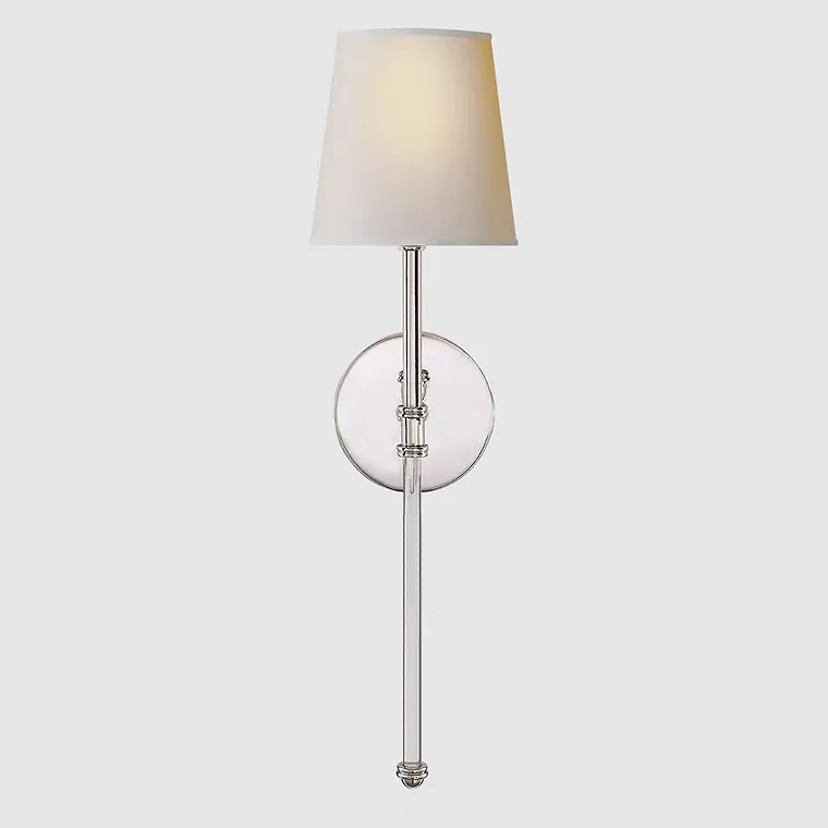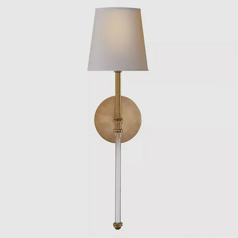 Настенный светильник с коническим текстильным абажуром на сборной стойке из латуни и хрусталя