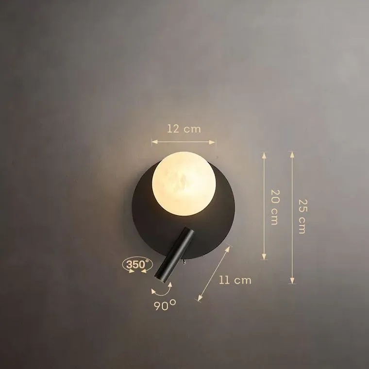 Независимые выключатели на каждом из плафонов позволяют включать и выключать светильник по отдельности, создавая индивидуальную атмосферу в каждой зоне. Круглое крепление диаметром 20 см обеспечивает надежную фиксацию светильника на стене, а также позволяет легко менять его положение. Диаметр мраморного плафона - 12 см, а длина спота - 11 см.