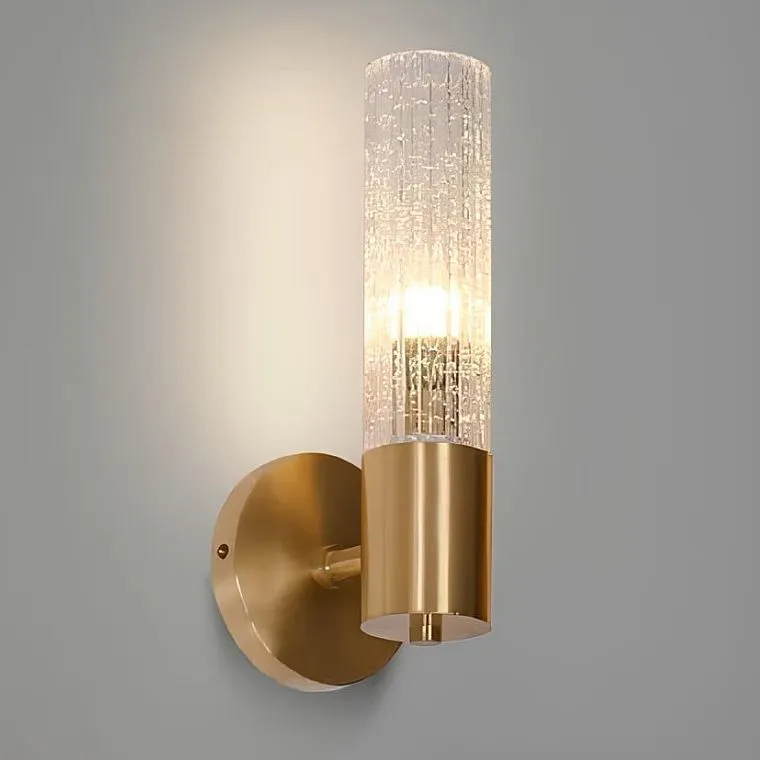 Серия настенных светильников с цилиндрическими плафонами из фактурного, кракелированного стекла и латуни